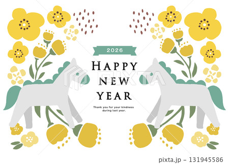木馬とゴールドフレームの年賀状 2026年/シンプルでエレガントな新年テンプレート