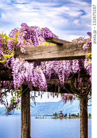 藤越しに望む洞爺湖の浮見堂