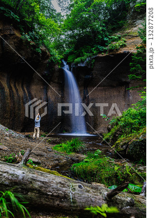 緑深い渓谷を流れ落ちる三階滝