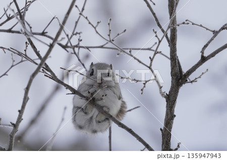 木の枝にとまる冬のエゾモモンガ