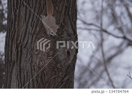 木に登る冬のエゾモモンガ