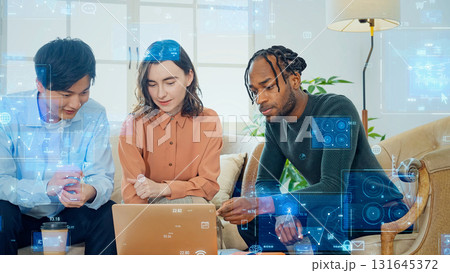 ミーテイングするビジネスパーソンのグループとデジタルテクノロジーのコンセプト