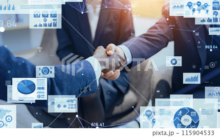 握手するビジネスパーソンとビジネスデータ