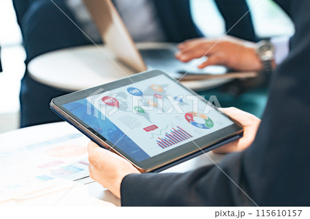 ミーティングする人々とデータ分析イメージ