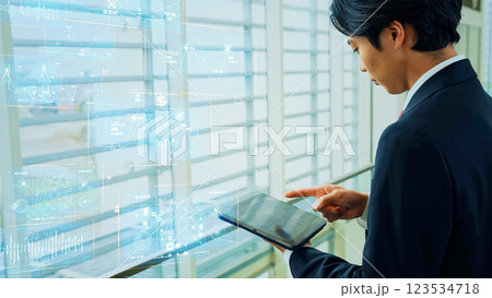 タブレットを使うビジネスマンとデジタルデータのイメージ