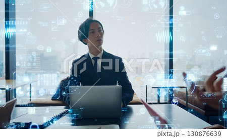 会議するビジネスパーソンとデジタルテクノロジー DX