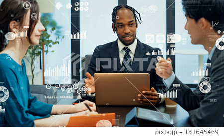 オフィスで会議する多国籍ビジネスパーソンのグループと統計データ
