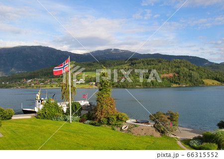 ノルウェー ハダンゲルフィヨルド、ウルヴィク地区に停泊中の遊覧船とノルウェーの国旗 別アングル