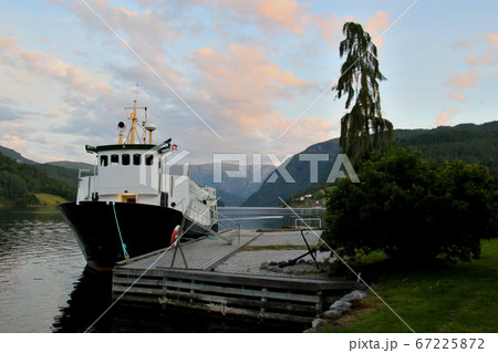 ノルウェー ハダンゲルフィヨルド、ウルヴィク地区のホテルより南東の波止場で白夜の黄昏を待つ小型遊覧船