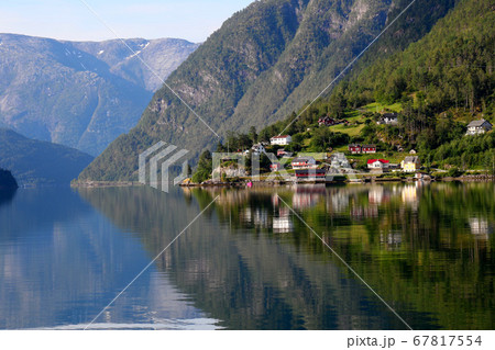 ノルウェー ハダンゲルフィヨルド、ウルヴィク地区より水面とのどかな建物を望む