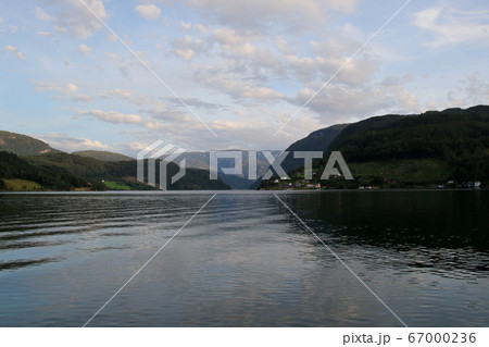 ノルウェー ハダンゲルフィヨルド、ウルヴィク地区、さわやかな早朝の山々と水面と広々した空の風景を望む