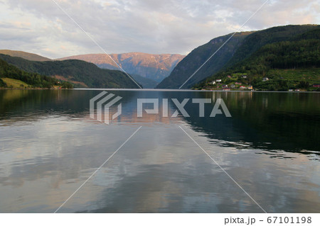 ノルウェー ハダンゲルフィヨルド、ウルヴィク地区、さわやかな朝の山と水面と空の凛とした風景