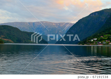 ノルウェー ハダンゲルフィヨルド、ウルヴィク地区ホテルより南側の黄昏時の静かな水面と夕日の山を望む