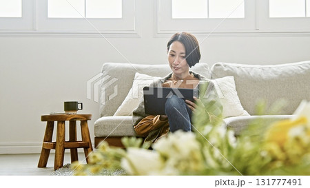ルームウェアを着て窓際に立ちノートパソコンを操作する女性