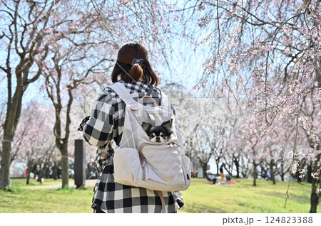 犬用リュックに入る愛犬と満開の桜並木の中を散歩する女性 ロングコートチワワ 春の素材