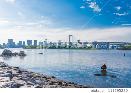 (東京都)お台場海浜公園から眺める水上バスとレインボーブリッジ