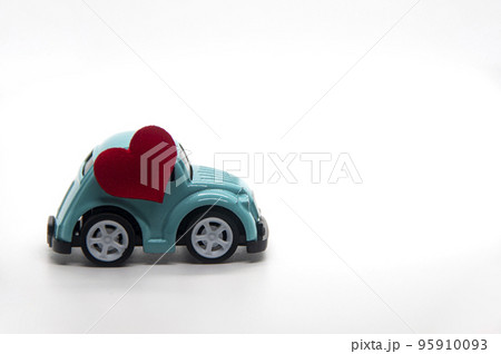 Mini toy car carrying red heart shape with customizable space for text and ideas. Relationship and Valentine's day concept. Copy space