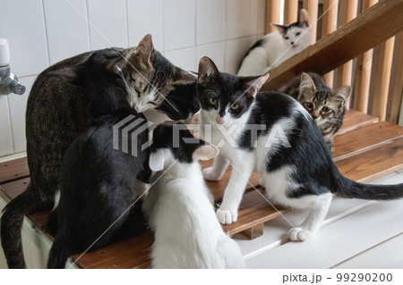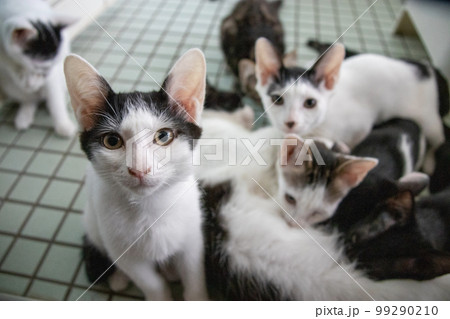 段ボールの中にいるたくさんの猫 雑種