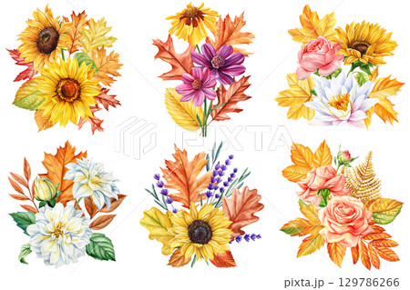 Watercolor autumn floral bouquets with sunflowers roses dahlias cosmos lavender and colorful seasonal leaves on white