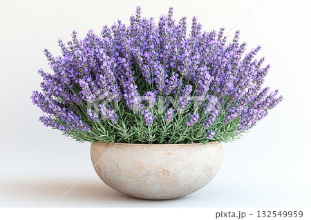Blooming bright purple flower. Ceramic pot in village style with lavender plant with purple flowers on a white background.