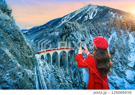 Tourist looking out the window enjoying with Train passing through famous mountain in Filisur, Switzerland. Landwasser Viaduct world heritage with train express in Swiss Alps snow winter scenery.