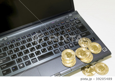 ビットコイン仮想通貨イメージ外出先でモバイル取引ノートパソコン