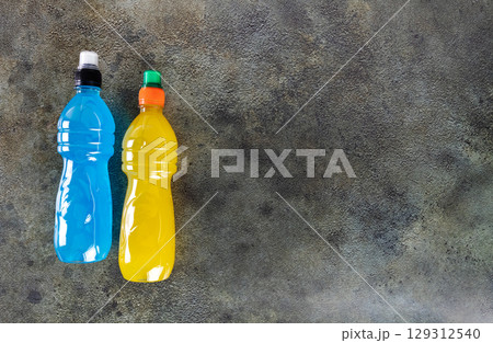 Blue bottle of isotonic drink, L-carnitine, sports energy drink on gray background. Bottle of fitness drink. Copy space