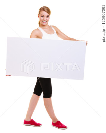 Fitness woman presenting blank empty ad banner