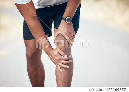 Running, knee pain and closeup of man in city for inflammation, accident and emergency. Fitness, workout and training with legs of male runner in road for muscle ache, sports injury and first aid