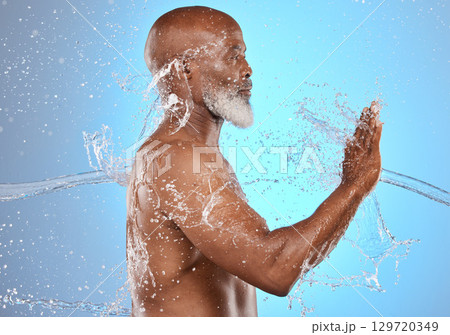Black man, skincare and water splash for beauty, cosmetics and dermatology on blue studio background for old age skin and body. Model cleaning, washing and shower for hygiene, health and wellness