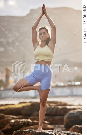 Yoga, woman and meditation beach rock, outdoor and workout for wellness, health and calm. Athletic girl, practice and breathing exercise for balance, relax and active for peace, focus and meditate.
