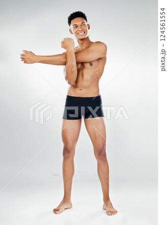 Fitness, stretching and happy topless man, body positive mindset and motivation for healthy lifestyle. Exercise, gym and health workout, fit black man athlete in studio on white background in Brazil.