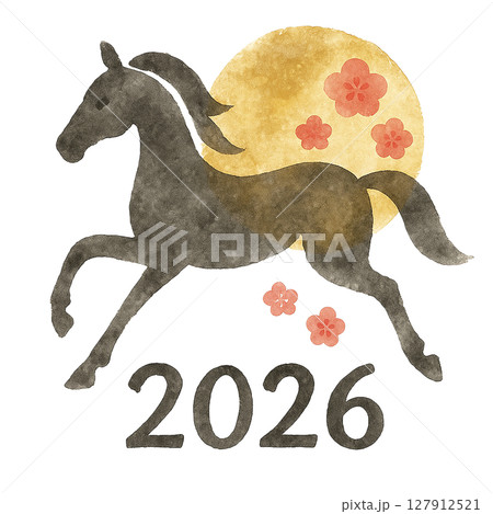 2026年 午年の馬シルエットと満月&梅 水彩風切り抜き素材