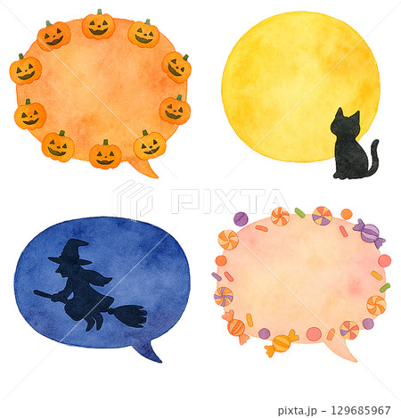 水彩ハロウィン吹き出しセット かぼちゃランタン 黒猫 魔女 お菓子 イラスト素材