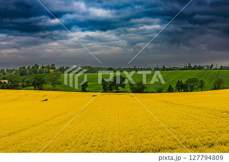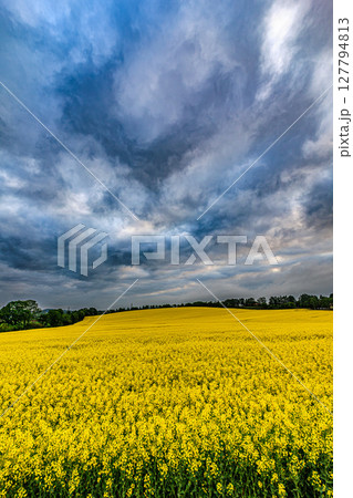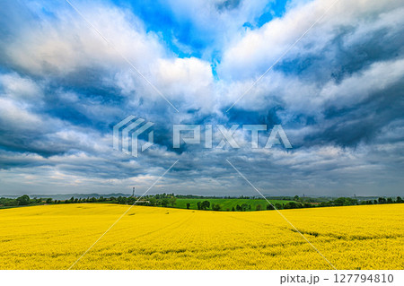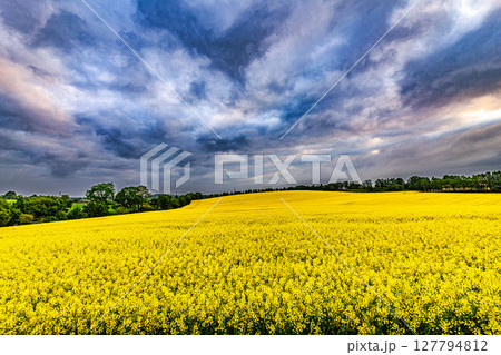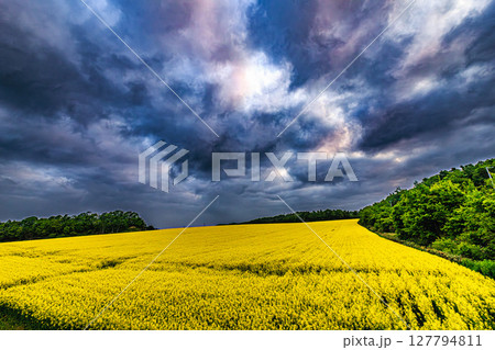 菜の花咲く大地、空を覆う雲のグラデーション