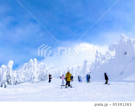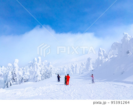 雲の切れ間から覗いた樹氷を眺める人々 (山形県、蔵王温泉スキー場)