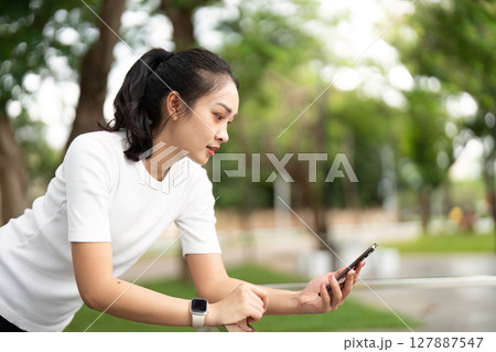 Focused Fitness Routine. Young woman checking phone while leaning on railing in park.