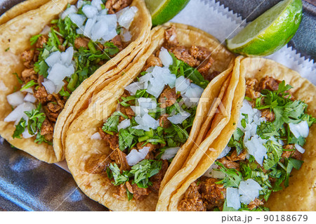 Close up of Authentic Mexican taco steak with onions, cilantro, and lime