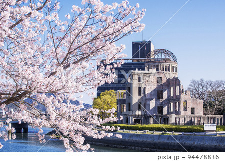 満開の桜と原爆ドーム 平和記念公園の春の風景 広島観光名所 2023年G7サミット