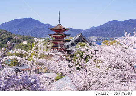 桜に包まれる五重塔 春の宮島の風景 桜と厳島神社と豊国神社 広島観光名所 安芸の宮島
