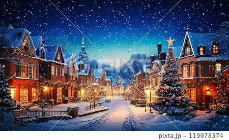 雪が降る夜にクリスマスの飾りやイルミネーションで浮かび上がる可愛いイラストの街