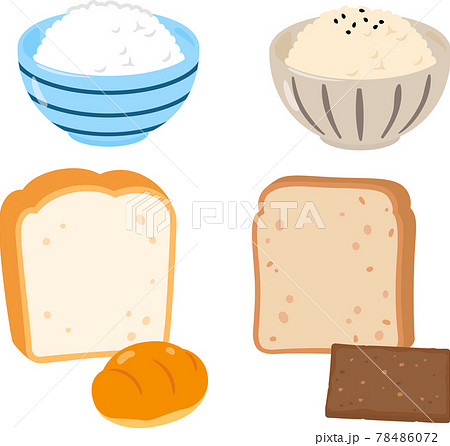 白米、食パン、玄米、ライ麦パンのイラストセット