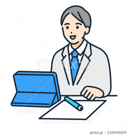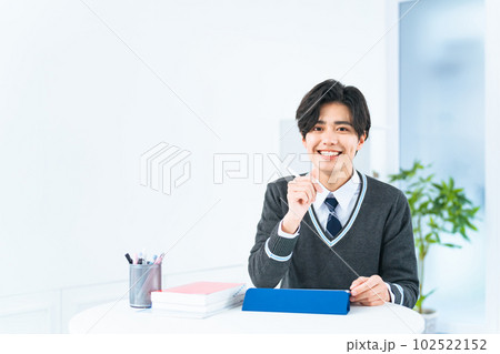 タブレットを使い宿題をする10代の学生。勉強する男子のベクターイラスト素材。