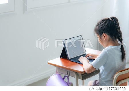 机に向かいタブレットを見る女子生徒のクローズアップ