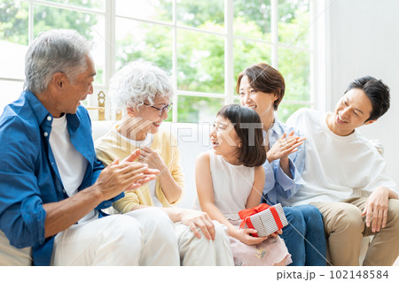 祖父母の古希を祝う三世代家族のイラスト 敬老の日 似顔絵