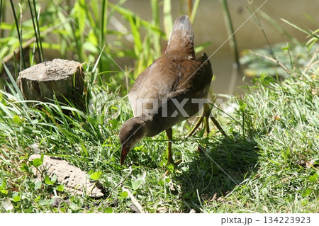 水草を食べるバンの幼鳥 バン 鷭 Gallinula chloropus 北海道の野鳥