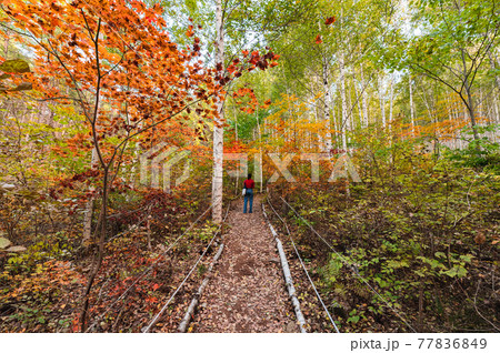 Tourist woman standing in birch forest with colorful maple at Inje national park