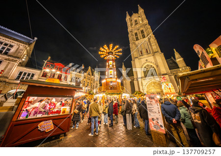 ベルギー・ゲントのクリスマスマーケット 聖バーフ大聖堂と夜の屋台風景
