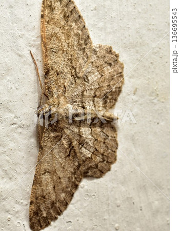 The fir geometer, a species of butterfly from the geometer family, sits on the wall.