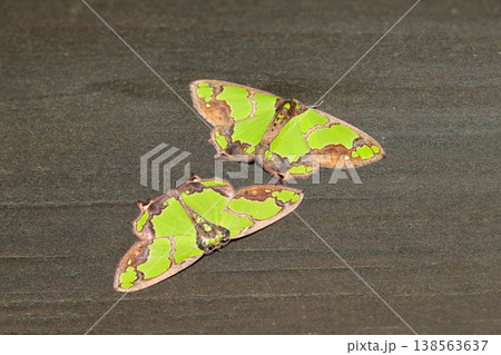 交尾後のアシブトチズモンアオシャク蛾カップル( Agathia visenda.昆虫類マクロ撮影)